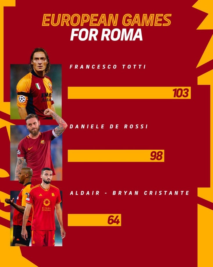 据统计,这是克里斯坦特罗马生涯欧战第64次出场,跻身罗马队史前三位。前两位分别是托蒂(103场)、德罗西(98场)。