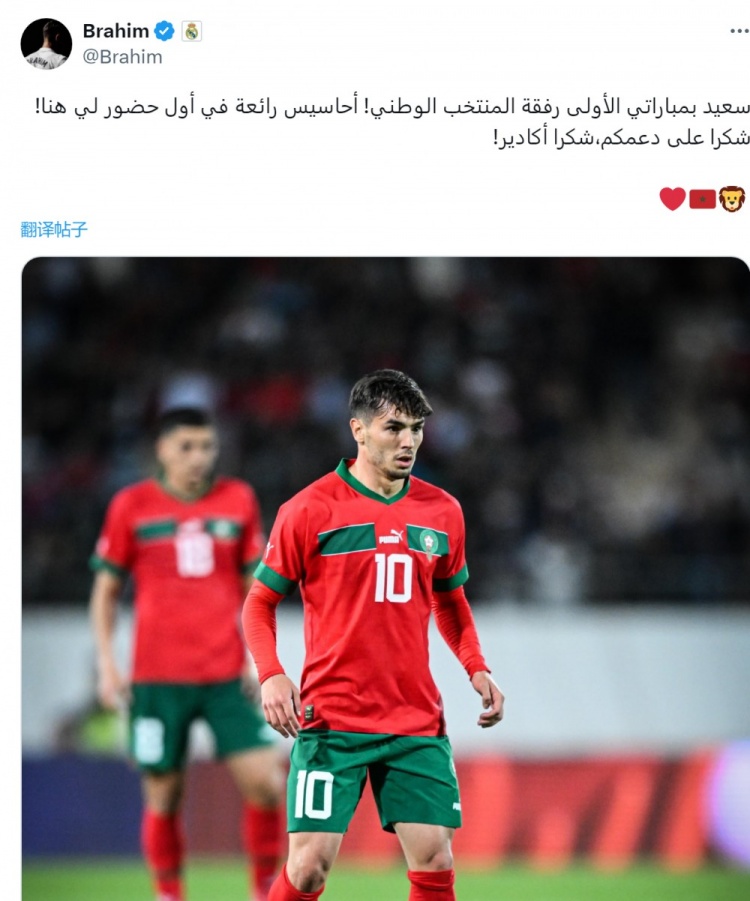 赛后迪亚斯在社交媒体上晒出自己的比赛照片,并写道:“很高兴为国家队出战首场比赛,第一次来到这里感觉很棒,感谢大家的支持。谢谢你,阿加迪尔(比赛地点)。”