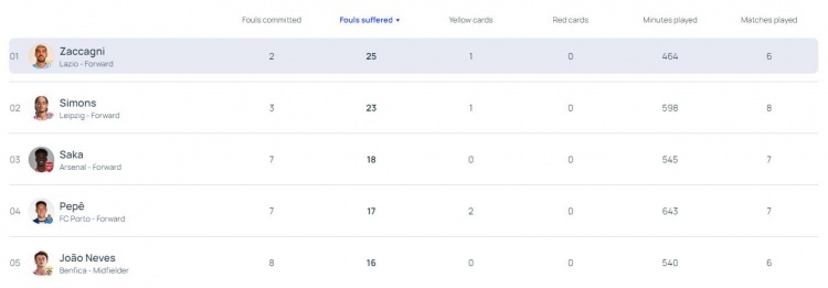 3月14日讯 本赛季欧冠1/8决赛结束,据欧冠官方统计,拉齐奥前锋扎卡尼是截至目前被犯规次数最多的球员(25次),哈维-西蒙斯、萨卡排在二三位。