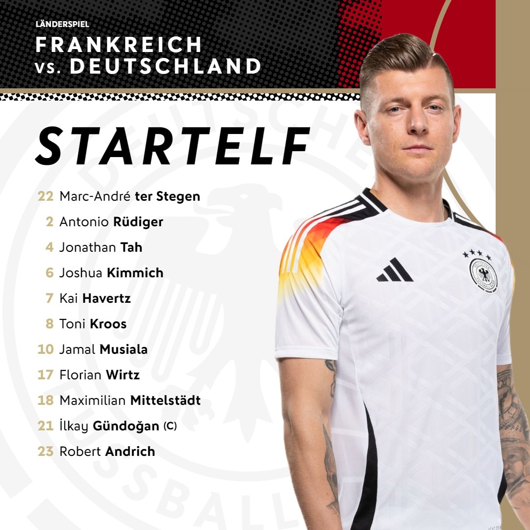 德国首发:22-特尔施特根、2-吕迪格、4-若纳坦-塔、6-基米希、7-哈弗茨、8-克罗斯、10-穆西亚拉、17-维尔茨、18-米特尔施塔特、21-京多安、23-安德里希