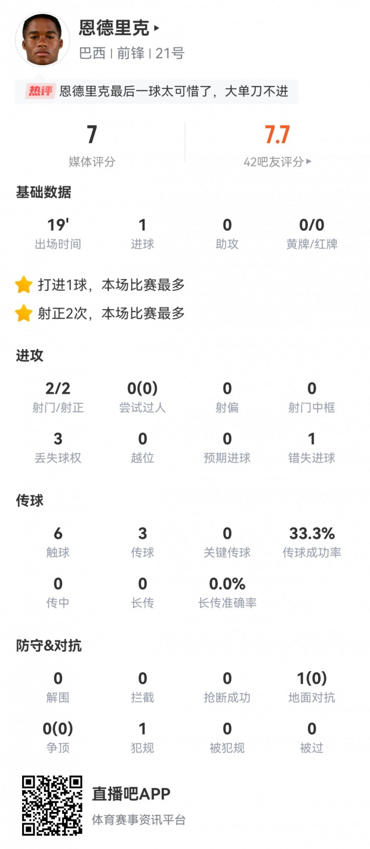 3月24日讯 友谊赛,英格兰0-1巴西。17岁恩德里克替补登场打进处子球制胜,球员全场重点数据如下↓