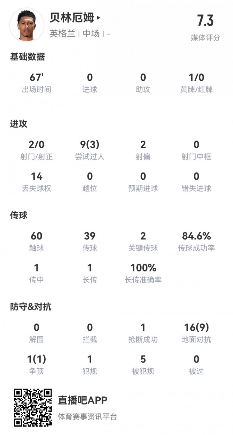3月24日讯 正在进行的友谊赛,英格兰暂0-0巴西。贝林厄姆首发出战66分钟被换下,球员全场重点数据如下↓