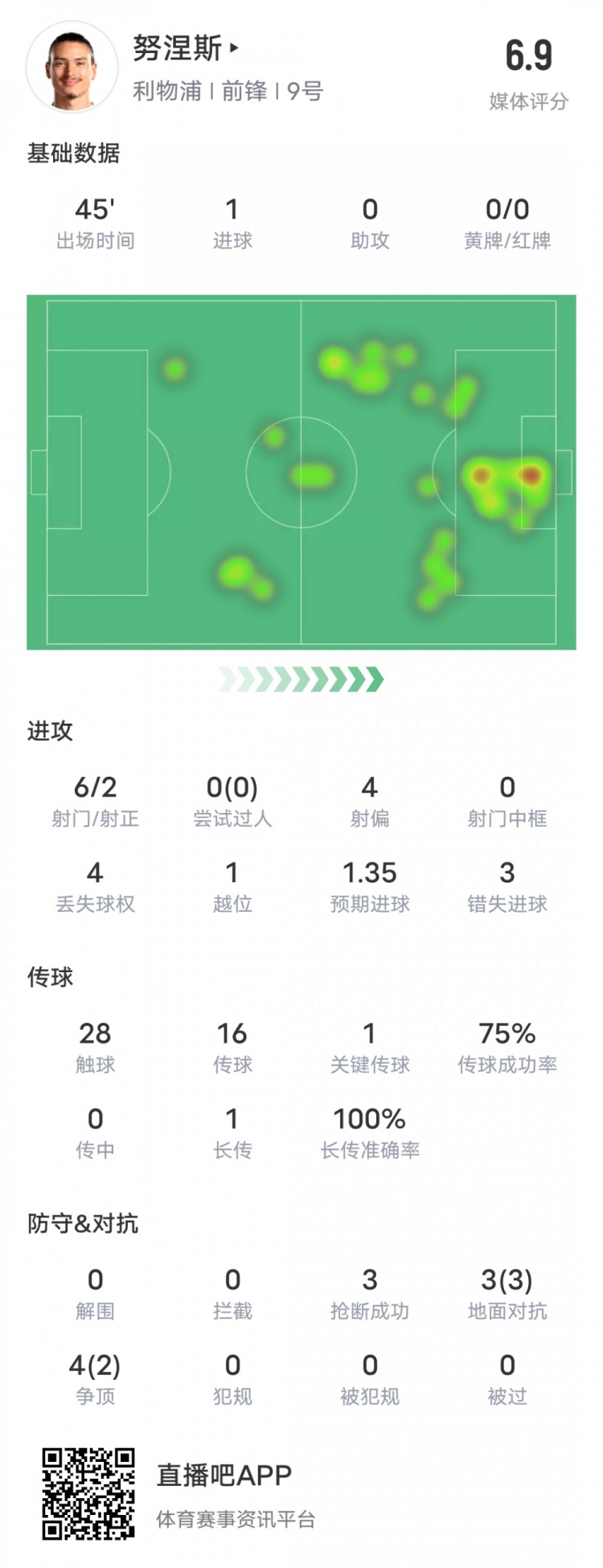 努涅斯本场比赛数据: