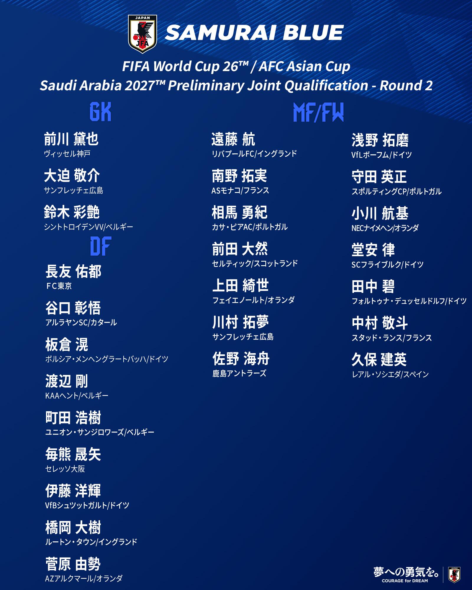 中前场:远藤航(利物浦)、南野拓实(摩纳哥)、相马勇纪(卡萨皮亚竞技)、前田大然(凯尔特人)、上田绮世(费耶诺德)、川村拓梦(广岛三箭)、佐野海舟(鹿岛鹿角)、浅野拓磨(波鸿)、守田英正(葡萄牙体育)、小川航基(横滨FC)、堂安律(弗赖堡)、田中碧(杜塞尔多夫)、中村敬斗(兰斯)、久保建英(皇家社会)