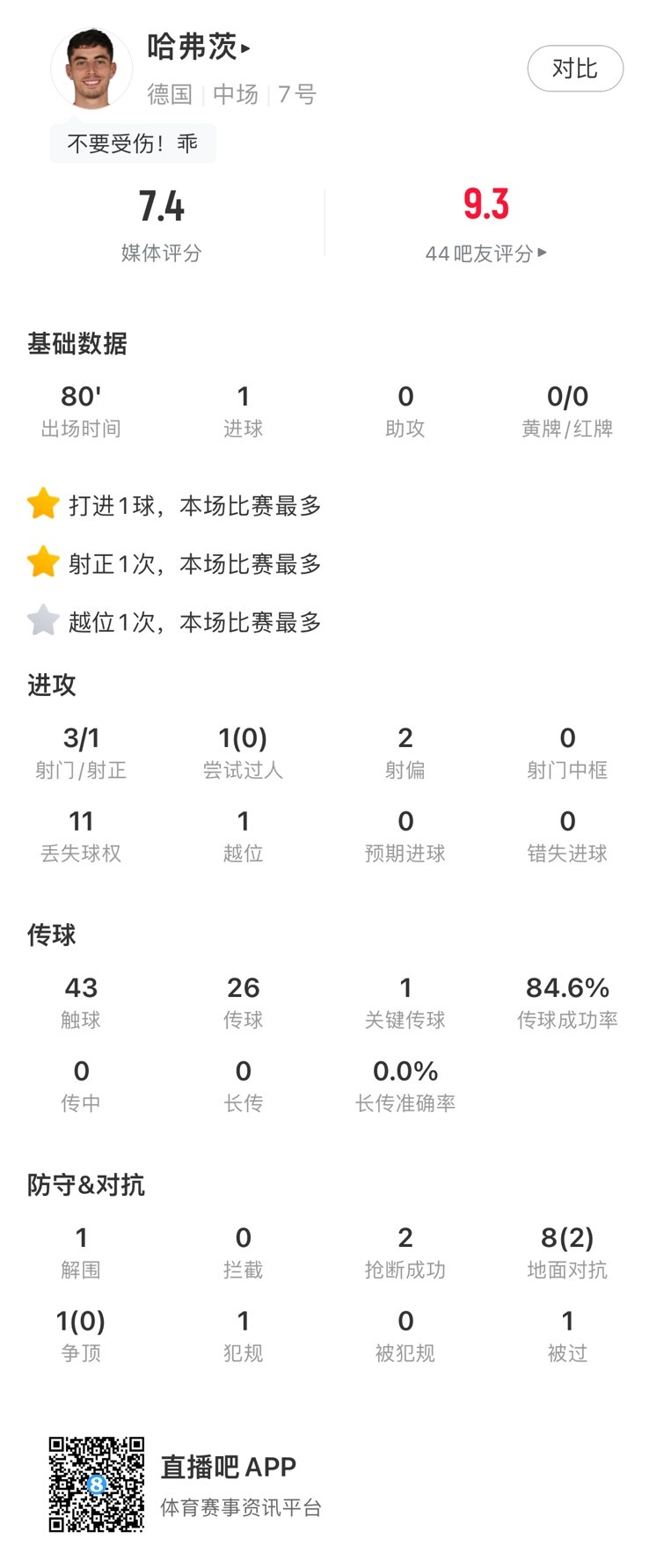 触球43次,传球26次,关键传球1次,传球成功率84.6%