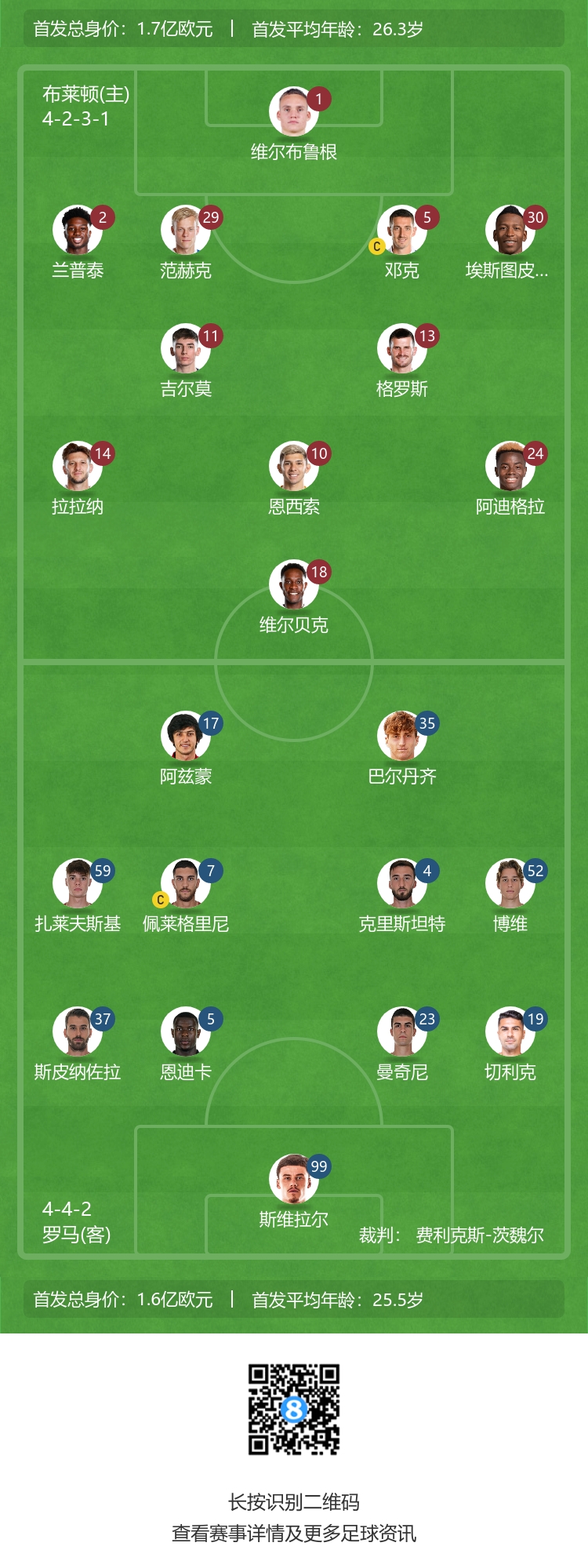 布莱顿替补:23-斯蒂尔、38-麦克吉尔、3-伊戈尔、4-韦伯斯特、15-莫德尔、20-巴莱巴、28-埃文-弗格森、31-法蒂、34-维尔特曼、40-布纳诺特、44-珀皮翁、47-博艾蒂
