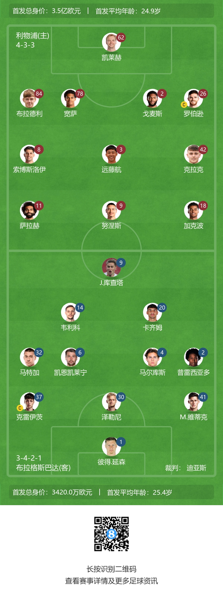 利物浦首发:62-凯莱赫、84-布拉德利、2-乔-戈麦斯、78-宽萨、26-罗伯逊、3-远藤航、8-索博斯洛伊、42-克拉克、18-加克波、9-努涅斯、11-萨拉赫