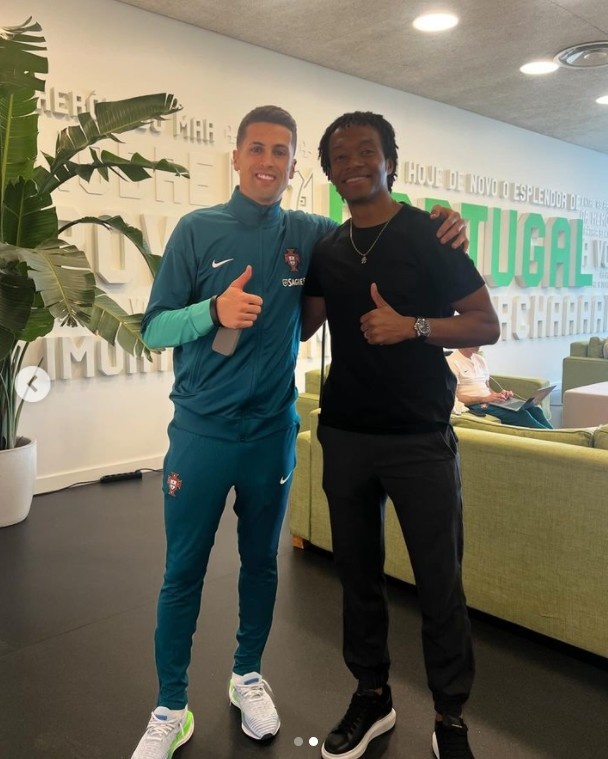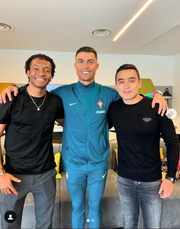 3月25日讯 在个人社媒,哥伦比亚球员夸德拉多晒出与C罗、坎塞洛的合影。