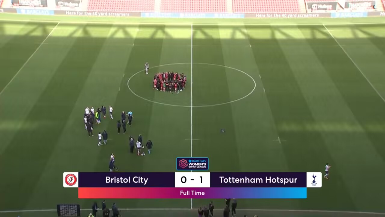 此战过后英女超还剩最后5轮,热刺女足继续位居第6,落后第5的曼联3分;布里斯托尔城女足6分继续垫底。