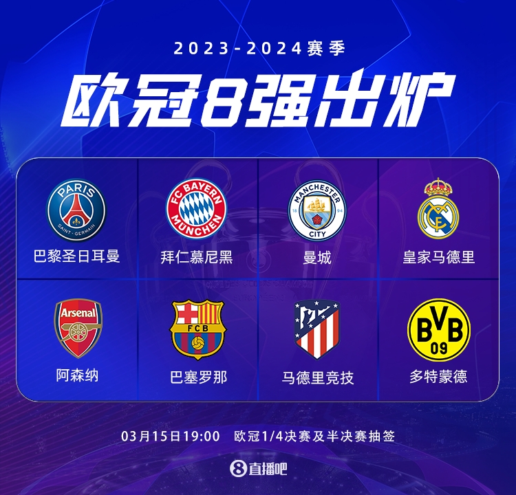 03月14日讯 欧冠1/8决赛全部战罢,欧冠八强出炉:巴黎圣日耳曼(法甲第一)、拜仁慕尼黑(德甲第二)、皇家马德里(西甲第一)、曼城(英超第三)、巴塞罗那(西甲第三)、阿森纳(英超第一)、马德里竞技(西甲第四)、多特蒙德(德甲第四)。