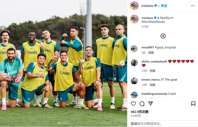 赛前,C罗也晒出了和达洛特、佩佩、迪亚斯和若奥-内维斯等队友的合影,似乎是队内分组对抗赛的赢球小队。照片中,C罗比起了“拳击”手势,他还配文:家庭。