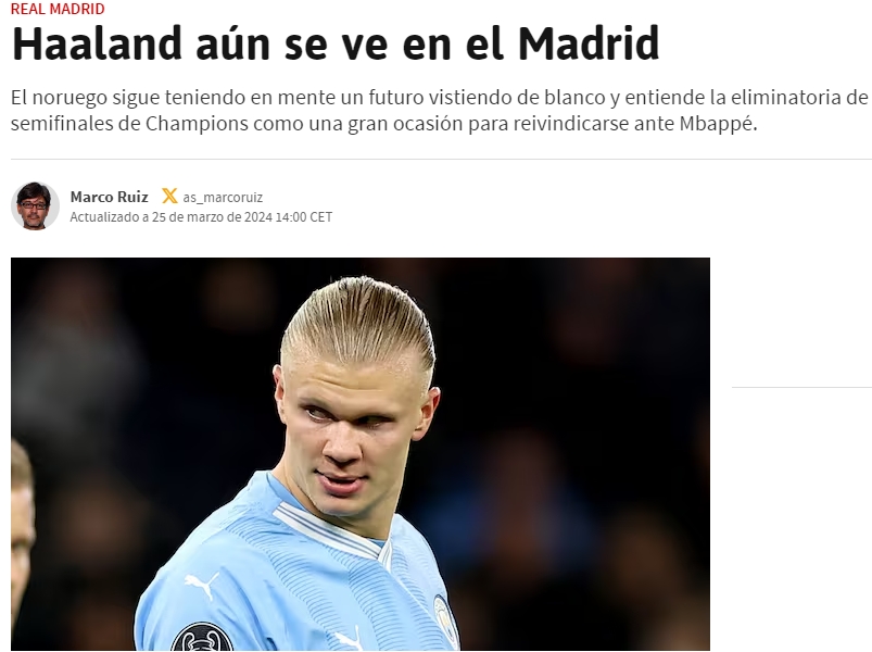03月25日讯 西班牙媒体《阿斯报》报道,曼城前锋哈兰德仍然认为自己未来会为皇家马德里效力,并认为两队在欧冠1/4决赛的交手,将是证明自己的机会。