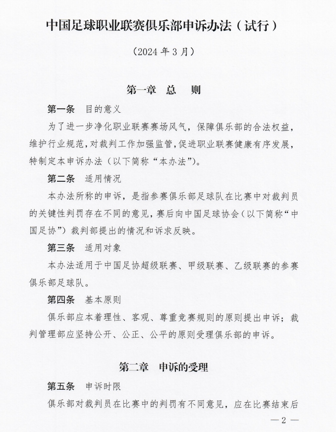 3月25日讯 中国足协今天印发了《中国足球职业联赛俱乐部申诉办法(试行)》,适用情况为中国足协三级联赛参赛球队,在比赛中对裁判员的关键判罚存在不同意见的情况。