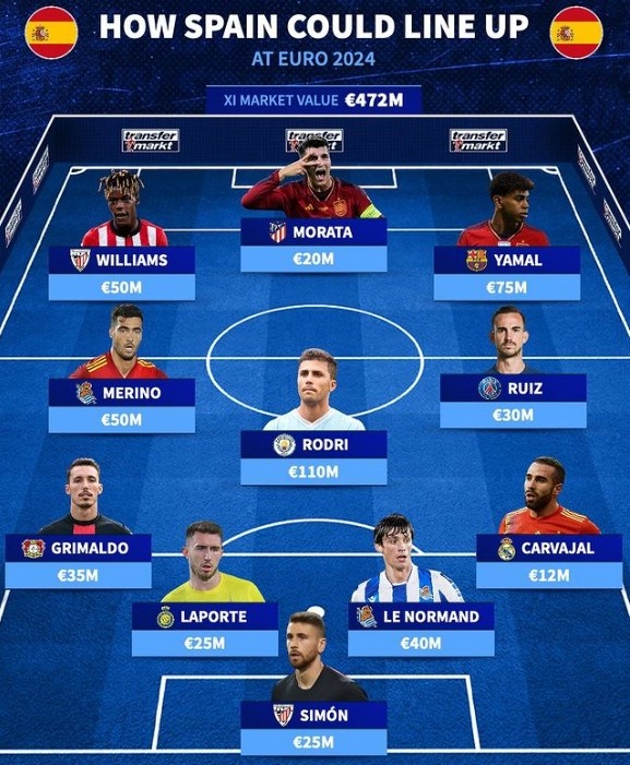 3月26日讯 德国欧洲杯将在今夏举行,《转会市场》也预测了西班牙队的主力阵容情况。