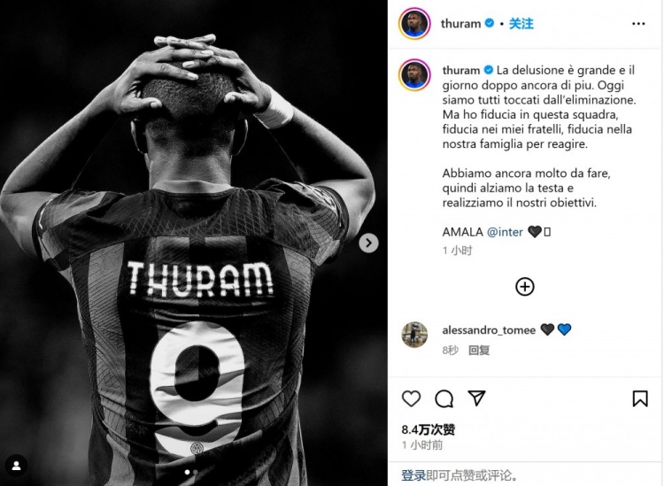 3月15日讯 欧冠1/8决赛,国米在点球大战中不敌马竞,无缘8强。赛后,小图拉姆更新了社交媒体动态,为球队鼓舞士气。