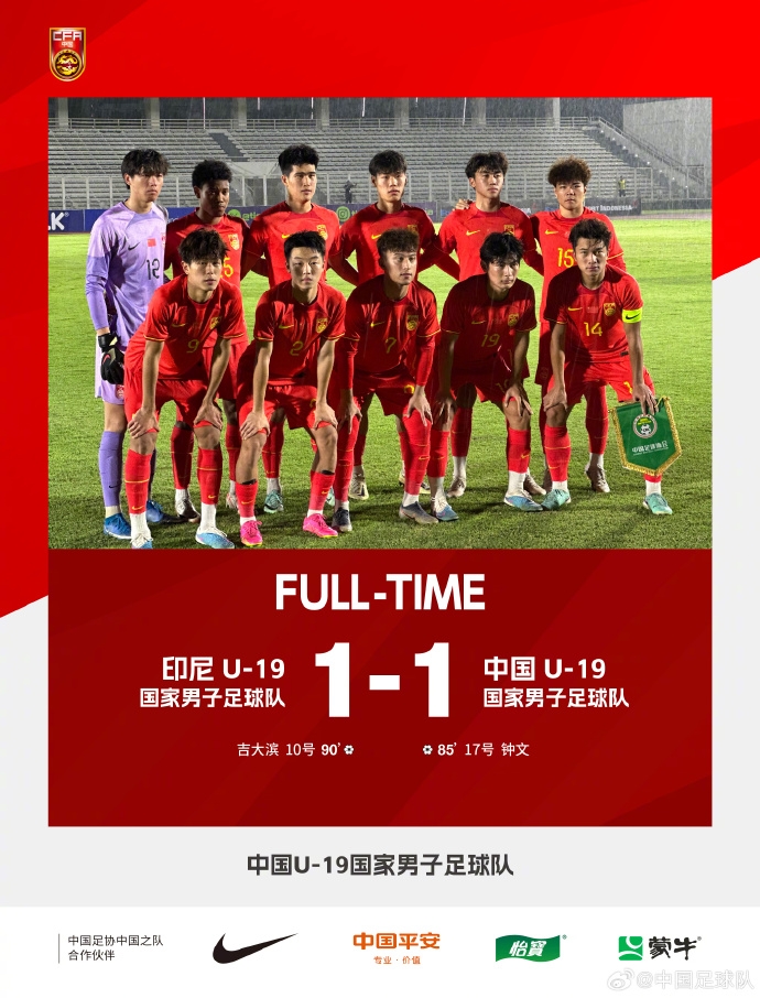 比赛第85分钟,印尼队门将传球被中国队抢断,随后,刘诚宇送出助攻,钟文门前轻松破门。第90分钟,印尼队传中被解围,10号吉大滨禁区弧顶直接凌空破门,将比分扳平。