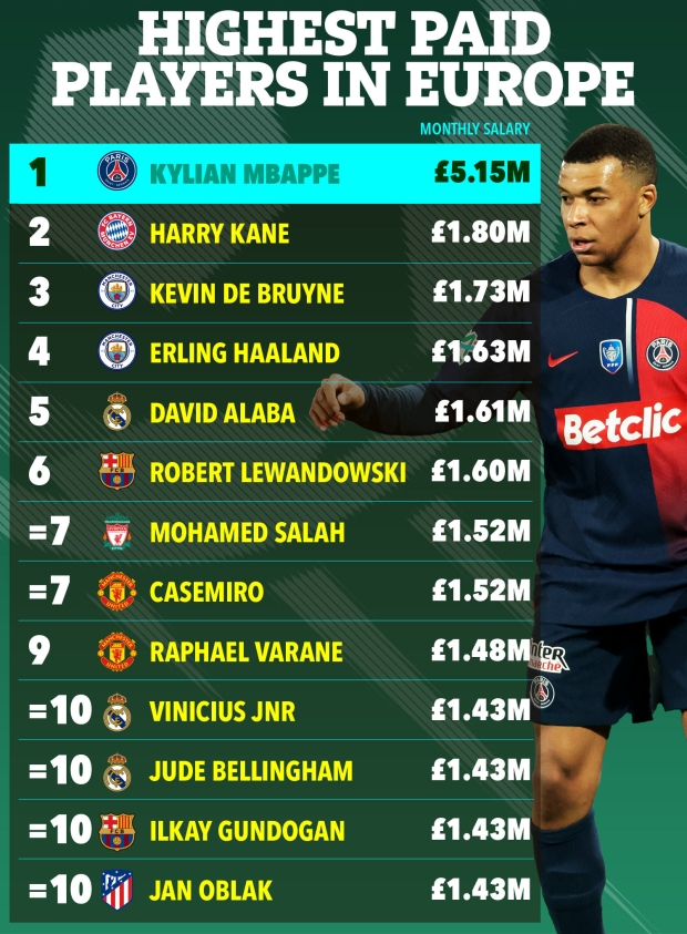 3月26日讯 日前,《太阳报》盘点了在欧洲联赛效力的球员月薪排行,姆巴佩以515万英镑居首。