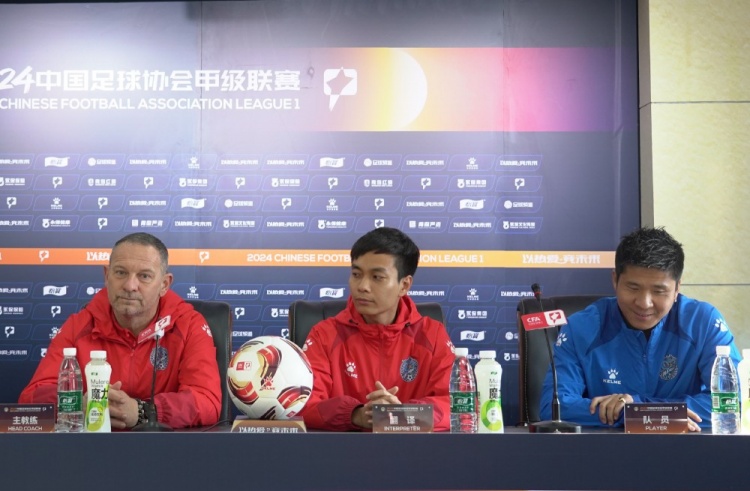 3月15日下午,中甲第2轮佛山南狮队赛前新闻发布会召开,主教练德扬·安东尼奇携队员赵明剑出席。
