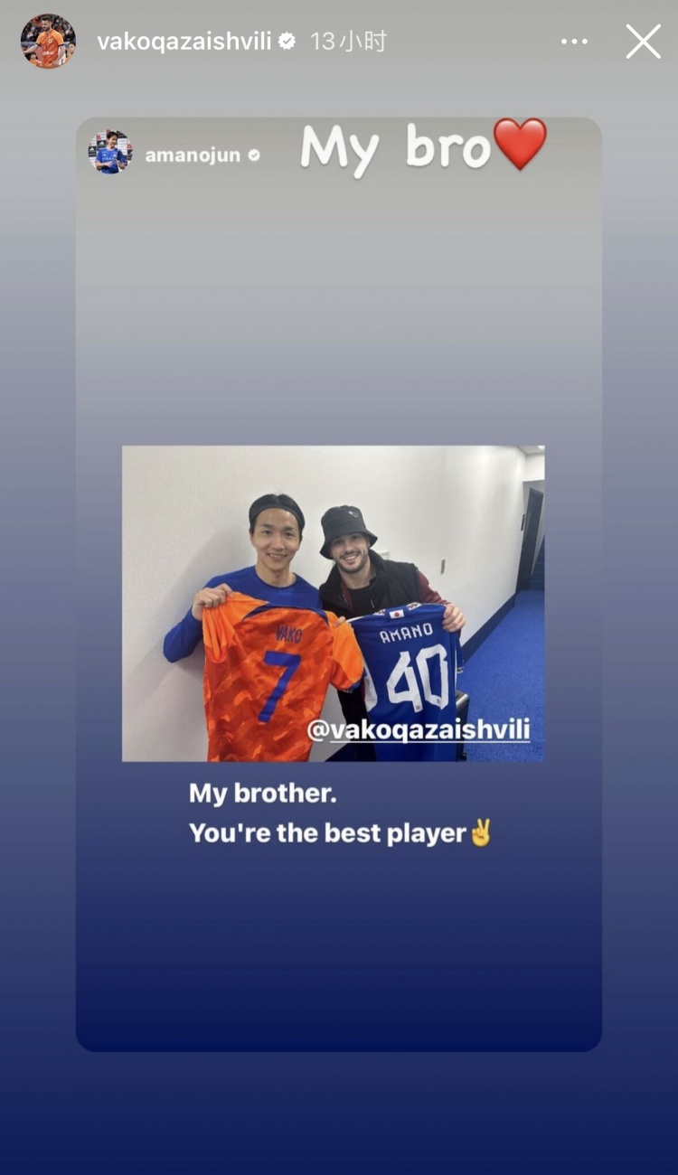 亚冠1/4决赛次回合,泰山客场0-1不敌横滨水手,总比分1-3止步于八强。赛后,横滨水手球员天野纯在社媒晒出了他与卡扎伊什维利交换球衣的合影并配文:“我的兄弟,你是最棒的球员。”卡扎伊什维利随即也回复天野纯“我的兄弟”,并附上了一个爱心的表情。