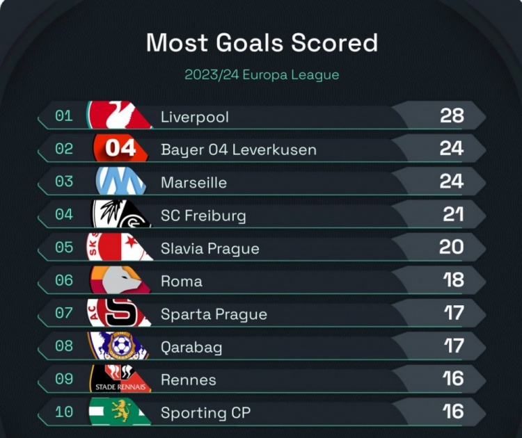 3月15日讯 Squawka统计了本赛季各球队在欧联杯中的进球数量,并列出榜单,利物浦以28球居首,勒沃库森、马赛打进24球并列次席。