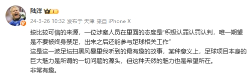 媒体人陆洋透露:“按比较可信的来源,一位涉案人员在里面的态度是‘积极认罪认罚认判,唯一期望是不要被终身禁足,出来之后还能参与足球相关工作。’