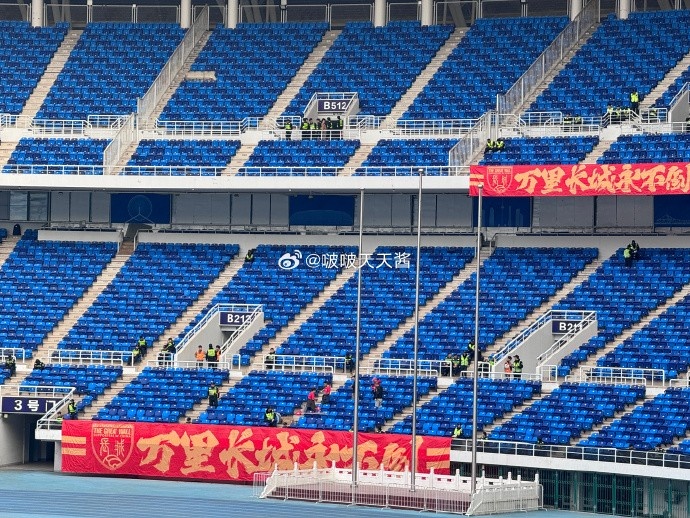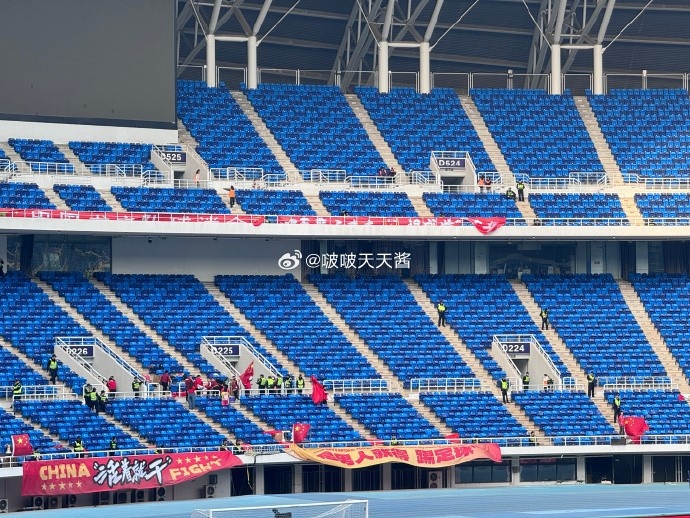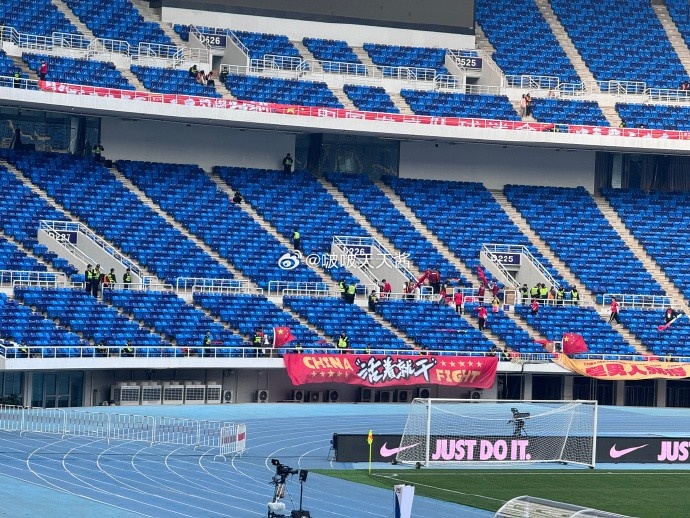 从博主“啵啵天天酱”晒出的现场照片看,水滴球场的看台上已经悬挂有为国足加油的标语,内容为“活着就干”、“是男人就得踢足球”、“万里长城永不倒”。