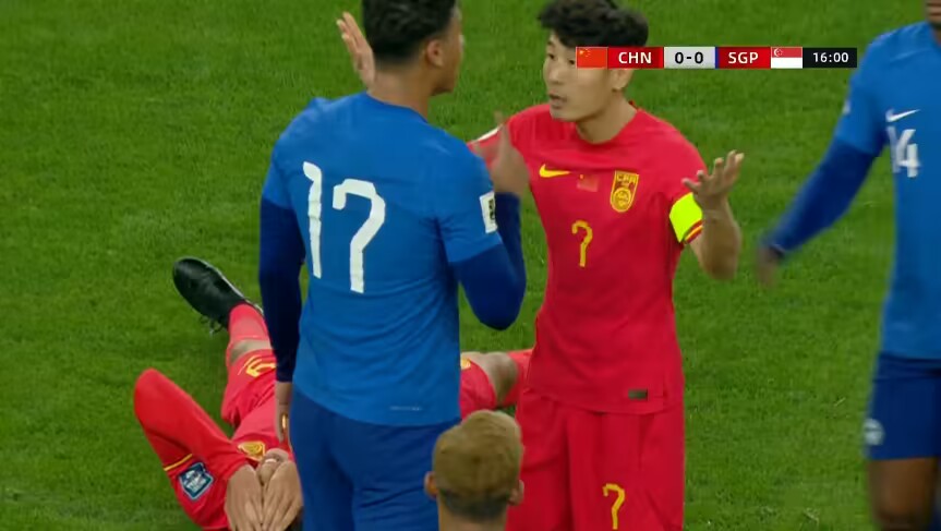 03月26日讯 国足vs新加坡第17分钟,王大雷长传策动,张玉宁争顶时被对手犯规,武磊上前理论,双方发生小摩擦。