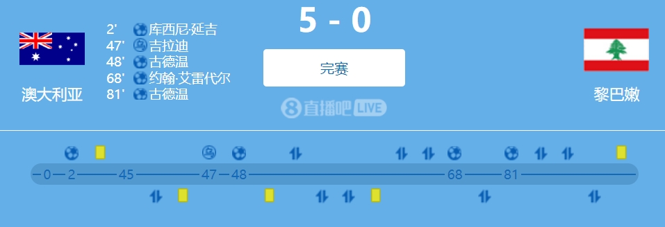 03月26日讯 世预赛亚洲区I组结束第四轮的一场较量,澳大利亚客场5-0大胜黎巴嫩,澳大利亚4战全胜打入15球且1球未丢,提前2轮晋级,成为首支晋级18强赛的球队。