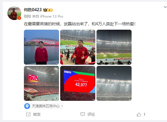 赛后,“退钱哥”何胜更新社媒:在最需要英雄的时候,武磊站出来了,和4万人奔赴下一场热爱!
