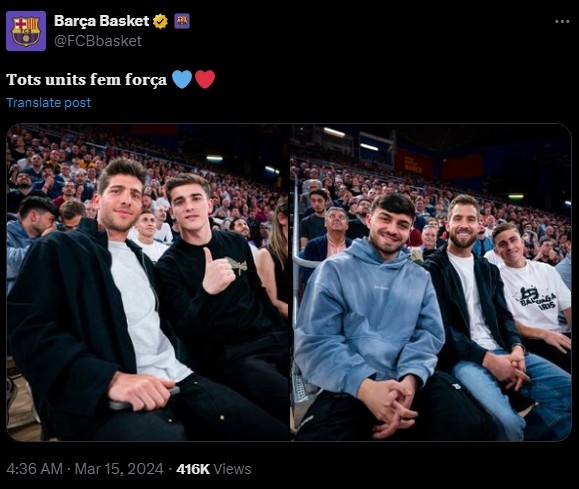巴萨篮球队此前在欧篮联中以94-76的比分击败了游击队,本场比赛,加维、佩德里等巴萨男足球员都到现场观战。