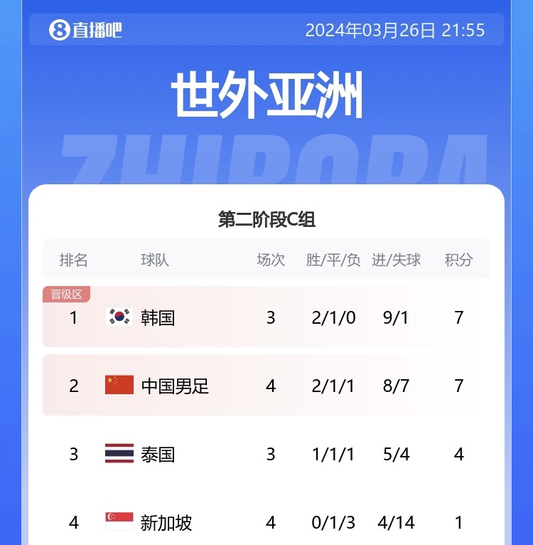 03月26日讯 男足世预赛亚洲区第二阶段C组第4轮,中国主场4-1击败新加坡。本组最新积分榜如下。