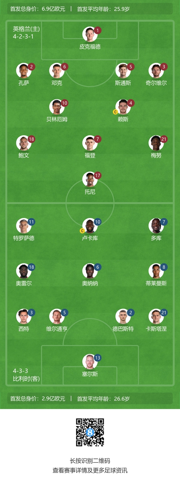 英格兰首发:1-皮克福德、5-斯通斯、6-邓克、2-孔萨、3-奇尔维尔、4-赖斯、21-梅努、10-贝林厄姆、7-福登、17-托尼、18-鲍文