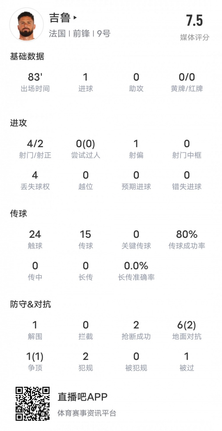 吉鲁本场比赛具体数据如下: