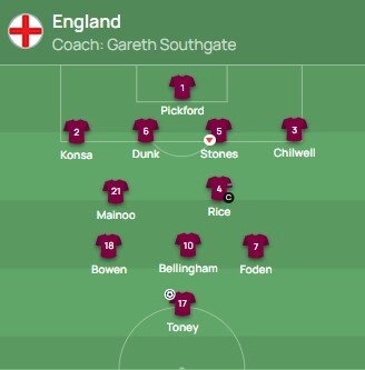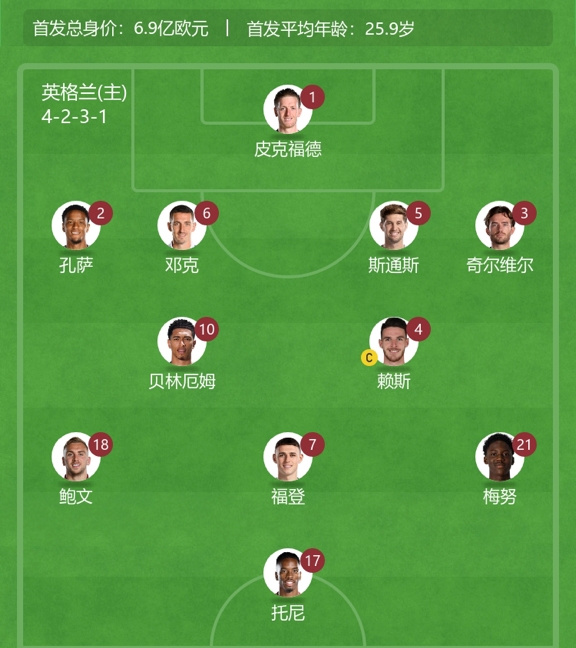 在本场比赛赛前公布的首发阵容中,梅努出现在左边锋位置、贝林厄姆踢后腰、福登前腰,和实际情况相差较大……