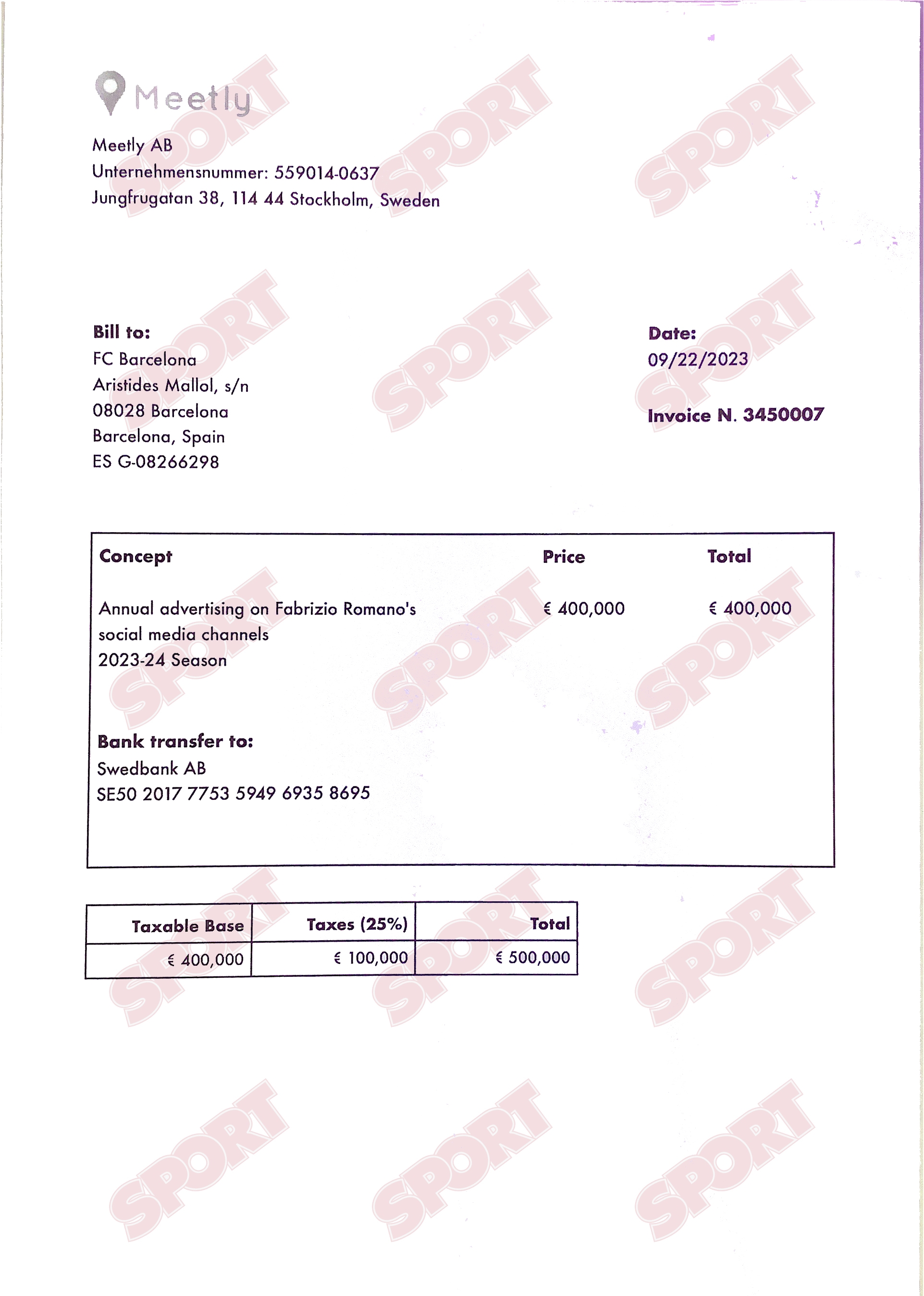 3月27日讯 曾在每日体育报任职的记者Josep Andres在社媒放出一张收据,称巴萨向罗马诺支付了40万欧广告费。