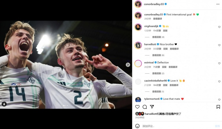 其利物浦队友范迪克、埃利奥特、凯莱赫等也纷纷评论为其送上祝贺。
