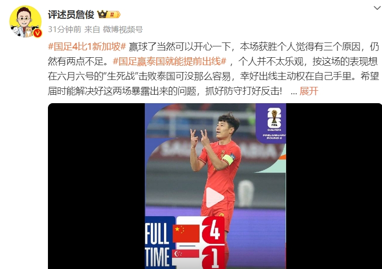 3月27日讯 世预赛国足4-1击败新加坡。赛后詹俊更新社媒并发布了点评,以及对之后比赛的展望。
