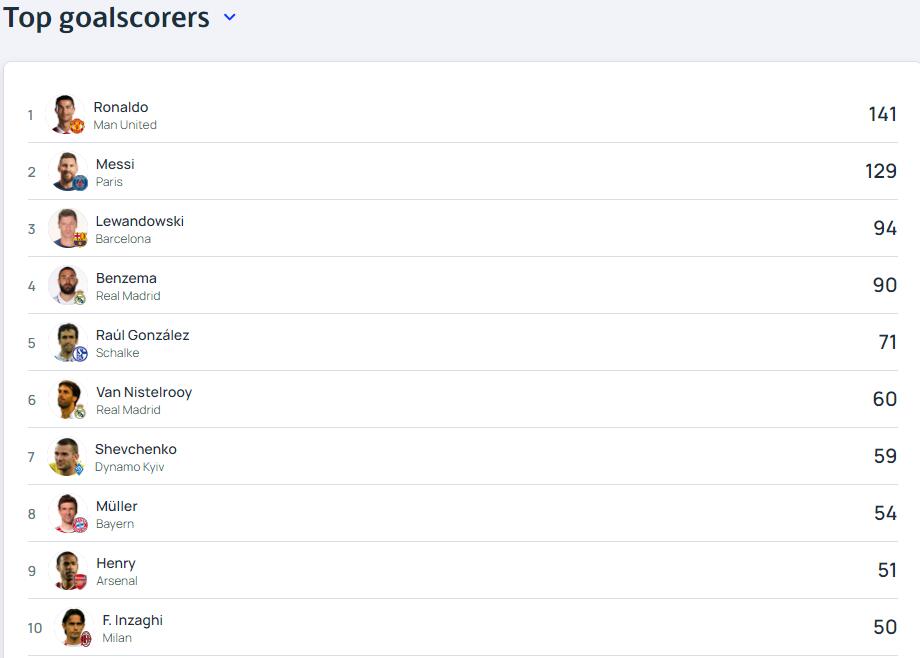 欧冠历史射手榜: