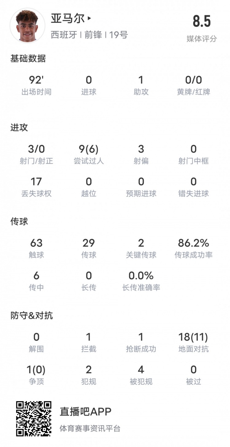 3月27日讯 在友谊赛对阵巴西的比赛中,亚马尔代表西班牙首发出战,贡献1次助攻,送出2次关键传球,还有6次过人成功,评分8.5。