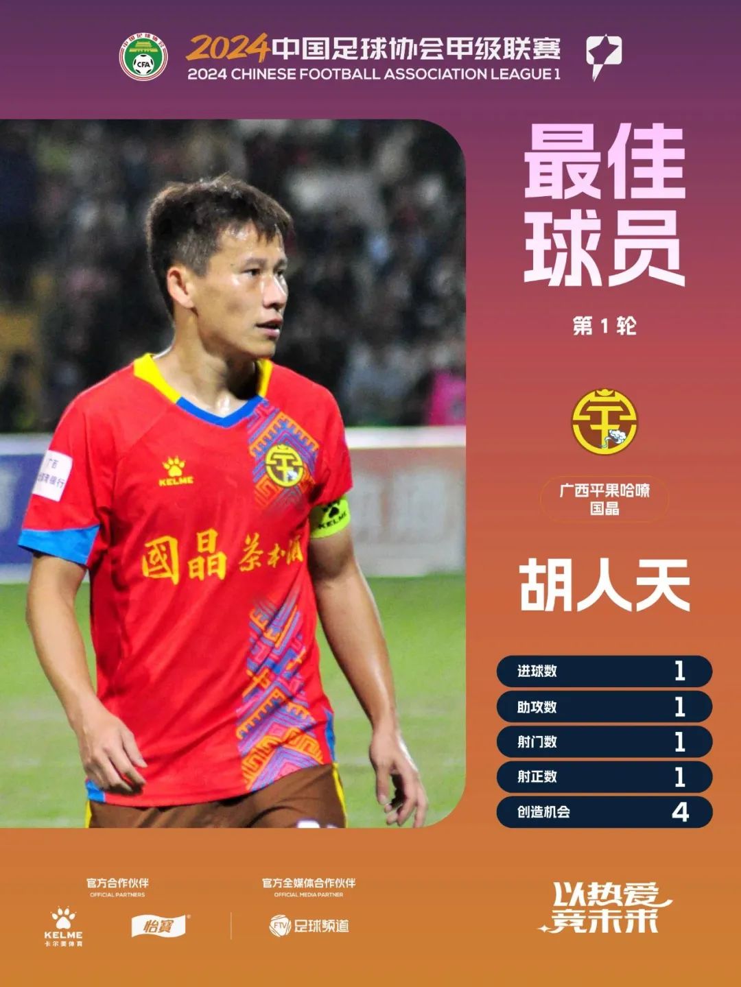 在2024赛季中甲联赛第1轮比赛中,广西平果哈嘹国晶队长胡人天在开场46秒时助攻队友孙伟哲远射破门,打入本赛季联赛首球;第13分钟胡人天在中路包抄完成进球,最终帮助球队2:0取胜。他也凭借一传一射的表现获得了全场最佳球员的荣誉。
