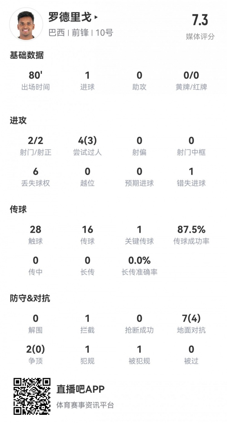 3月27日讯 友谊赛西班牙暂2-2巴西。罗德里戈首发出战81分钟打进一球,球员全场重点数据如下↓