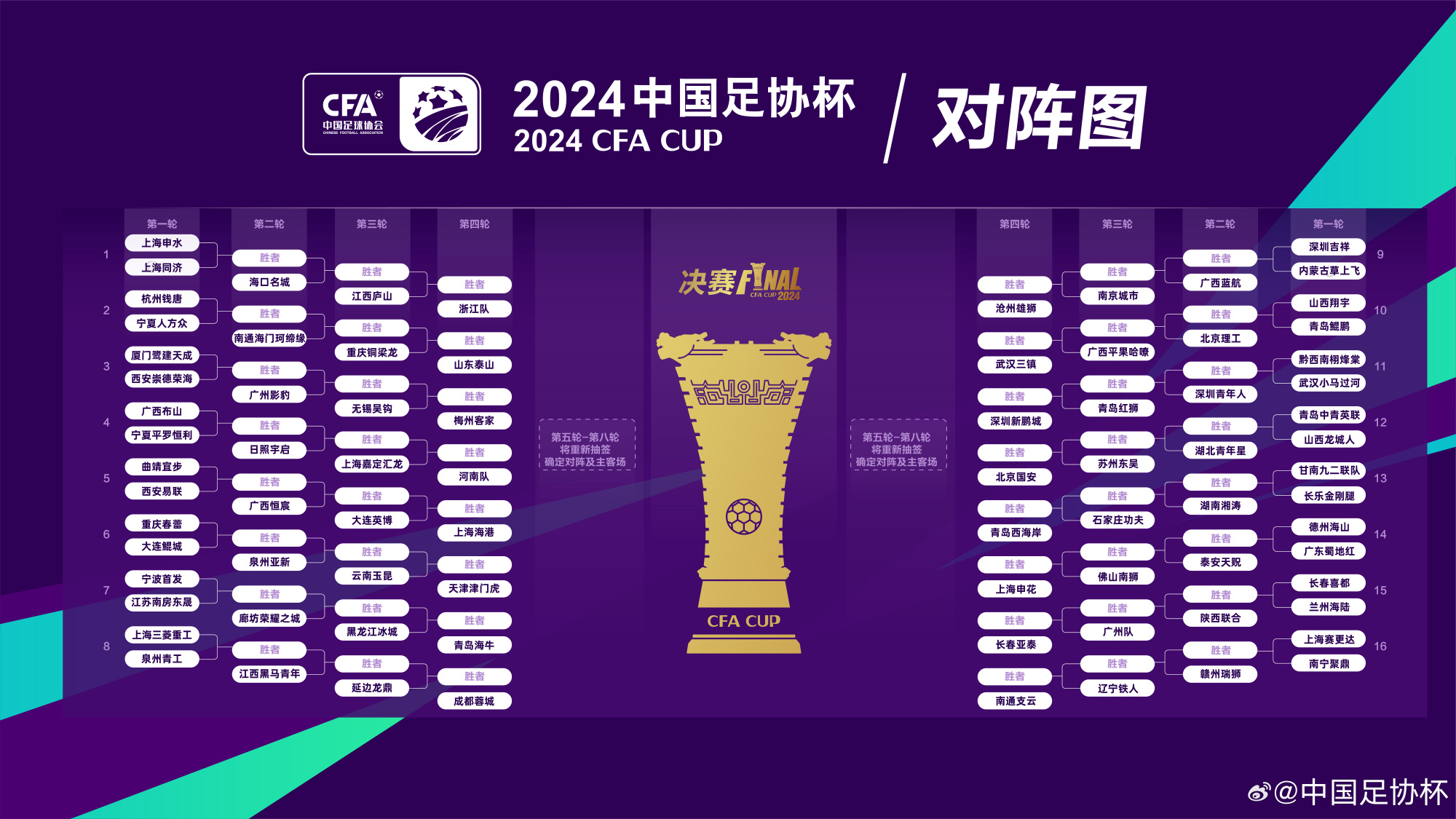 第一轮由30支业余队以及两支中乙球队参赛,胜者将与16支中乙各队进行第二轮的角逐。中甲和中超球队将分别在第三轮和第四轮亮相。