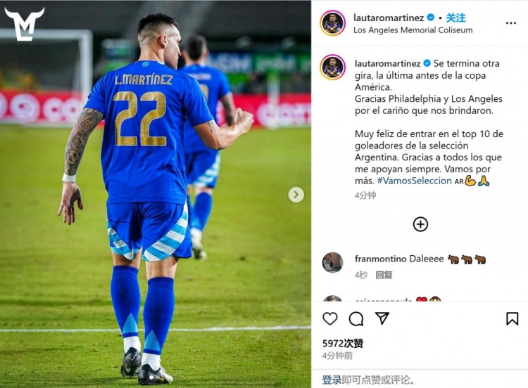 3月27日讯 在今天结束的友谊赛中,阿根廷3-1击败哥斯达黎加,劳塔罗破门,结束了近一年半的进球荒。赛后,他更新了动态,感谢球迷们的支持。