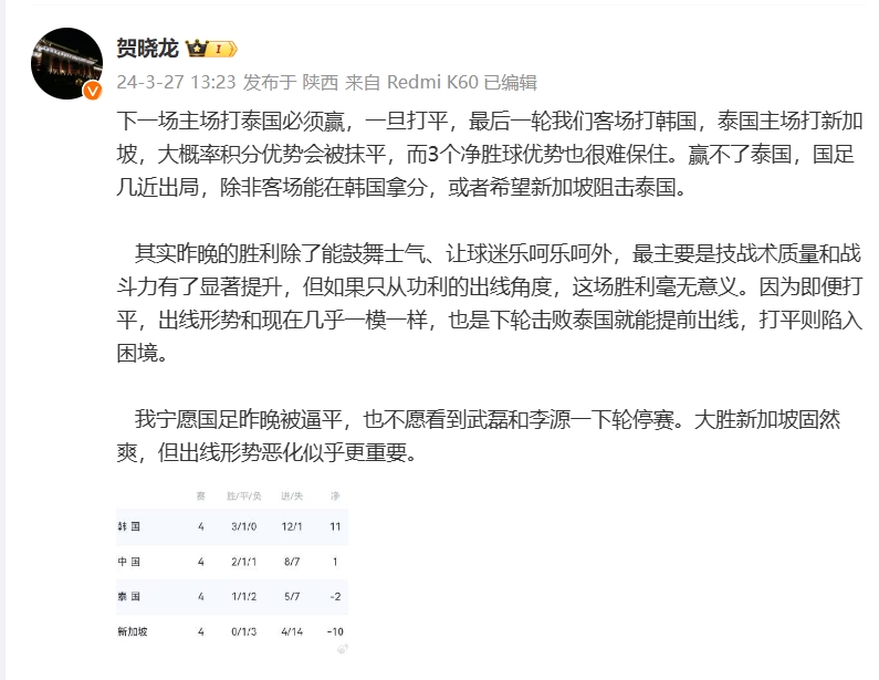 贺晓龙在个人微博中写道:下一场主场打泰国必须赢,一旦打平,最后一轮我们客场打韩国,泰国主场打新加坡,大概率积分优势会被抹平,而3个净胜球优势也很难保住。赢不了泰国,国足几近出局,除非客场能在韩国拿分,或者希望新加坡阻击泰国。