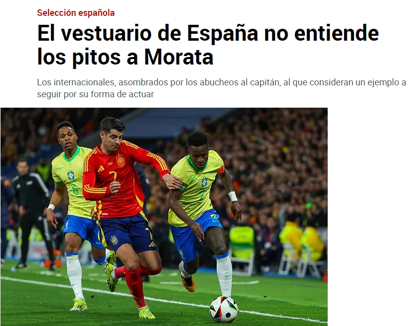 上届欧洲杯的嘘声开始,恰恰是在马竞主场大都会球场,这一切都发生在欧洲杯上。没有人能理解,但事实就是,球迷对莫拉塔犯错的容忍度是低于对其他任何球员的。这一点再次得到了证实。马卡表示,莫拉塔似乎成了每个人都可以拿捏的“玩偶”,而且没有合理的解释。甚至他的坦率和真诚的个性都给他带来了困扰,这是了解他的人无法理解的。