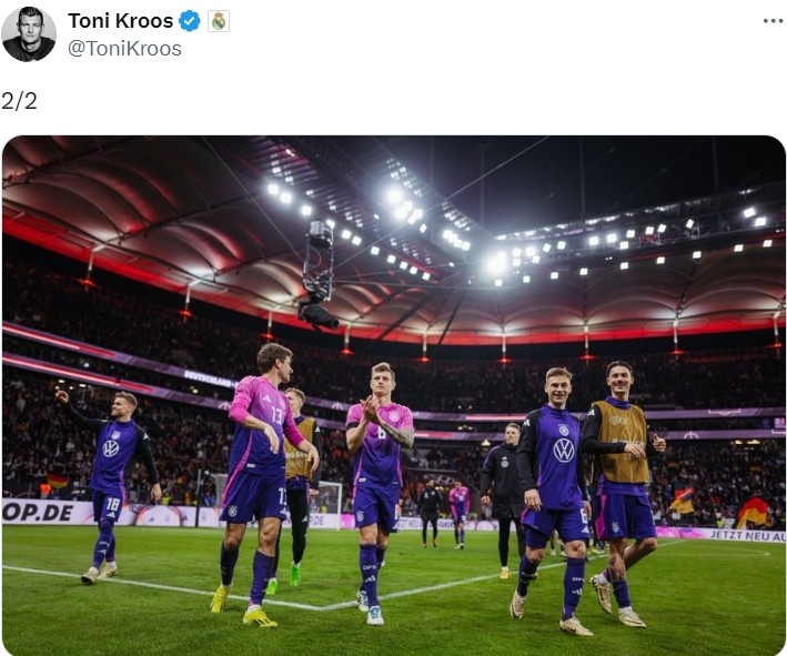 3月27日讯 德国中场克罗斯更新社交媒体动态,晒出了和队友一起庆祝胜利的照片,并配文:两场全部拿下。