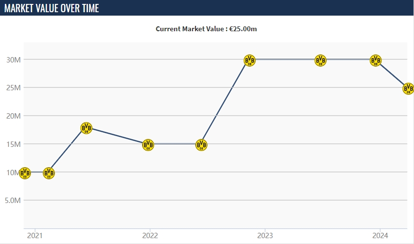 德转今日更新了德甲球队的身价,多特小将19岁的穆科科身价下滑500万欧,目前为2500万欧。