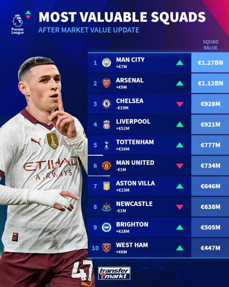 3月15日讯 德转更新了英超球员身价,并盘点了目前英超球队身价榜单,具体如下: