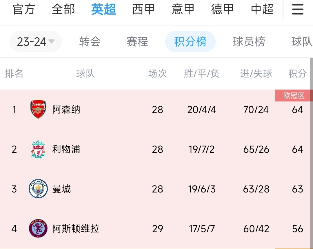 目前排在英超前三的球队分别是阿森纳、利物浦和曼城。争冠的这三支球队分差仅仅1分,一场比赛便极有可能改变排名形式。而本周末,阿森纳更是将直接与曼城进行交锋。