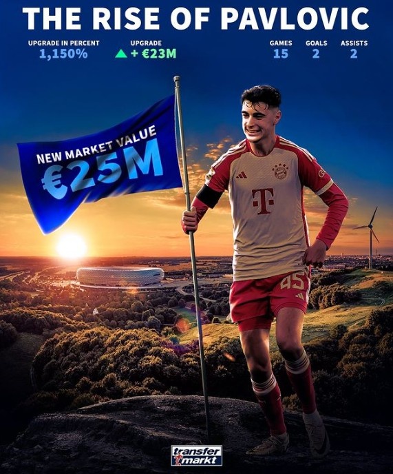 帕夫洛维奇身价上涨2300万欧元,相比此前的200万欧提升达1150%,当前身价已经达到2500万欧元。